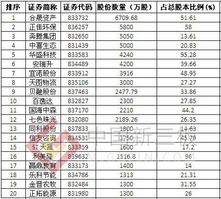 本期,质押股份数量超过1000万股的企业有25家,其中合晟资产6709.68万股份用于质押借款排名第一,其次依次是正佳环保5800万股份被质押、奔腾集团5050万股份被质押、华盛科技4240万股份被质押、安瑞升4200万股份被质押,还包括宜诺股份、天图物流、贝融股份、百逸达国海中森、七色珠光等质押股份超两千万股。