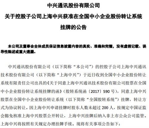 导读:2月3日消息,中兴通讯下午发布公告称,其控股子公司上海中兴通讯技术股份有限公司(以下简称“上海中兴”)获准挂牌新三板,转让方式为协议转让。