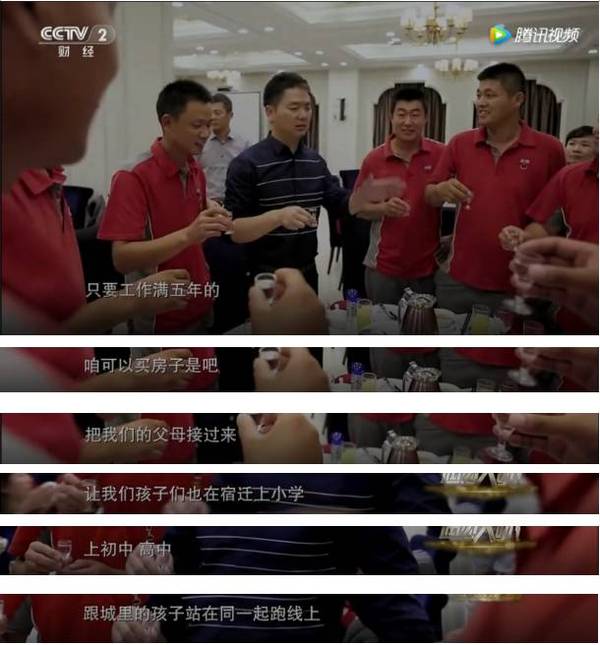 刘强东在聚餐中的每句话,都离不开员工的待遇问题,和兄弟们碰杯,他第一句就问:五年以上的员工,咱们现在能拿到多少钱?第二句问:交了五年的公积金,能贷款买房吗?还说将来京东要自己造房子,成本价卖给员工。