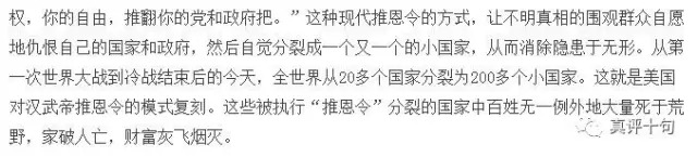 而把汉武帝鼓励诸侯王把土地分封给自己子孙、以此削弱诸侯力量的“推恩令”,套在美国头上,匪夷所思到什么程度?亲,你会陷入一种简直不知道从何处下手批驳的瞠目结舌,好吗?