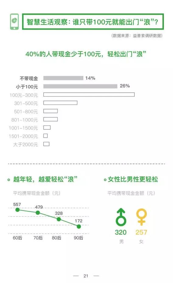 报告显示,目前,40%的人在出门的时候带的现金会少于100元,并且,人们所带现金在越年轻的群体中,会越少。在60后群体中,平均携带现金557元,到70后,这一数字为479元,80后为328元,90后直接来到了172元。