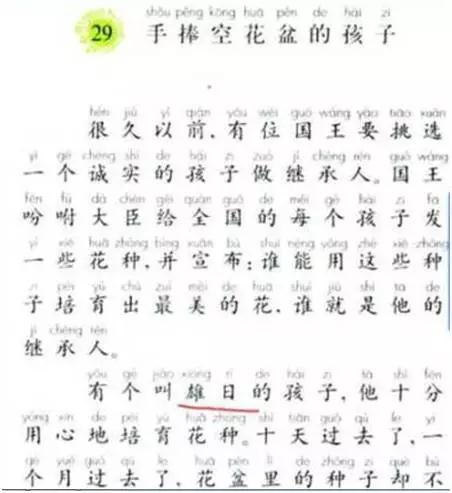 而另一篇课文《卡罗尔和他的小猫》是描述爱护动物,但又是外国人名;讲述诚实品质的《手捧空花盆的孩子》,用的是日本人名雄日,且配图小孩头绑扎带,明显日本小孩打扮。