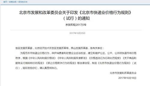 导读:全国首个针对快递业价格的规则在北京诞生。10月25日,北京市发改委印发了《北京市快递业价格行为规则(试行)》(以下简称《规则》),对快递业价格明确提出了“12条不准”。
