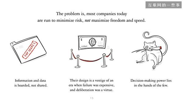 问题是,今天的大多数企业,他们的目的是让风险最小化,而不是让自由和速度最大化。信息和数据被严格保密,却没有用作共享。在过去的年代,犯错成本高昂,人们赞赏三思而后行,而他们的设计就是那个年代遗留的产物。决策权被掌握在少数人手中。