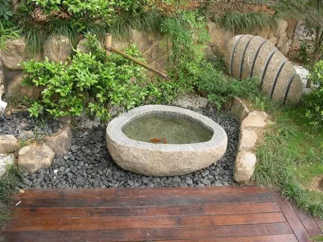 院中的鹿威,也叫惊鹿,竹木制,可接泉水,亦可惊鸟兽。▼