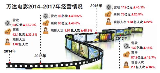 今年1月,万达电影发布2017年度经营简报,多个业绩数字均继续保持增长。但纵观万达电影近四年的经营数据可以发现,万达电影的营业收入、实现票房、观众人次的增长速度均处于逐渐下降的趋势,其中营业收入从2015年同比增长49.85%,变为2017年同比增长18%,实现票房和观众人次的增长率也分别从49.6%和48.9%变为15.7%和16%。