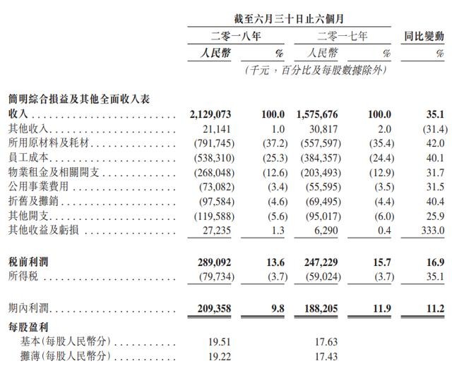 根据呷哺呷哺的中报显示公司收入达到 21.29 亿人民币,同比增长 35.1%;公司拥有人应占收入为 2.09 亿,同比增长 11.5%;从利润占比情况来看却比去年同期有所下降,从2017年同期的11.9百分点下降了2.1个百分点。报告内指出,业绩期内利润占收入的百分比下降原因有多方面,主要因原材料价格上涨、员工成本和物业租金均有所上涨等所致。
