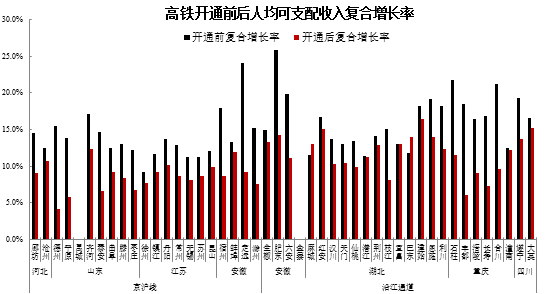 图8 高铁通车前后沿线城市人均收入复合增长率