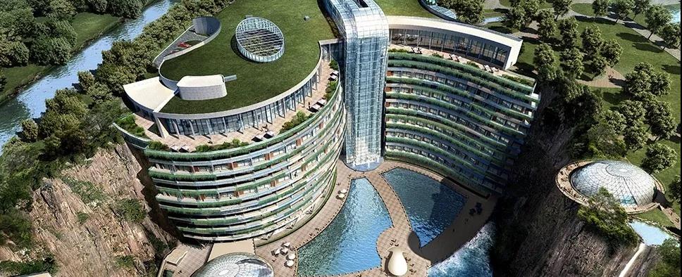 上海世贸深坑酒店,设有水下情景套房、与崖壁的自然资源融合定制的空中花园、从相同高度的悬崖上垂挂而下的壮观瀑布、搭积木一样建造的钢结构抗9级地震建筑,听起来就像是个“土豪”酒店?