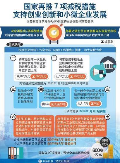 导读:4月25日召开的国务院常务会议决定,再推出7项减税措施,支持创业创新和小微企业发展。这已经是今年两会后,政府第二次推出针对企业减负的政策。