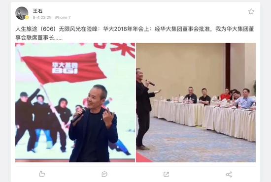 一年后,2018年8月4日晚,王石在其个人微博和微信宣布: 旅途无限风光在险峰,华大2018年会上,经华大集团董事会批准,我为华大集团董事会联席董事长。