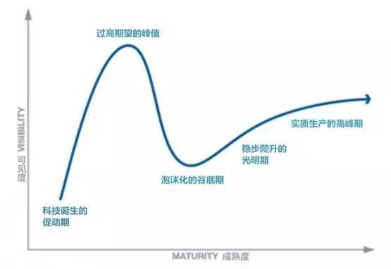 投资人和创业者应该都很熟悉这个Gartner曲线,每一项新的技术或者变化出现的时候都会有一个预期被炒作的阶段;到了峰值后因为预期过高和配套设施不足等原因泡沫破裂,会很快跌到低谷;然后开始稳定地爬升,在这个过程开始逐渐成熟并且产生实际价值。