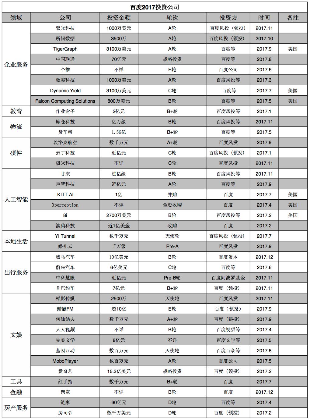 (数据来源:猎云网,投资方标注为“百度”、“百度公司”的可以理解为百度战投的投资。)(数据来源:猎云网,投资方标注为“百度”、“百度公司”的可以理解为百度战投的投资。)
