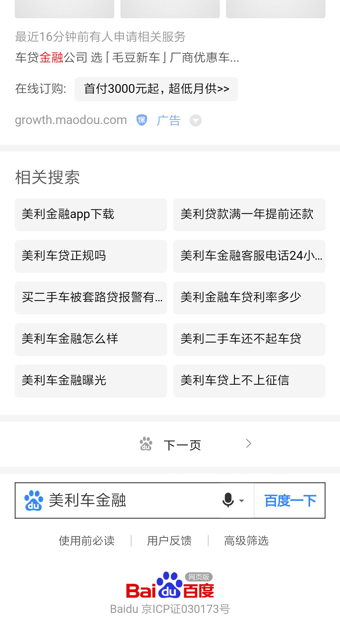 在百度搜索“美利车金融”,相关关键词很是触目惊心——