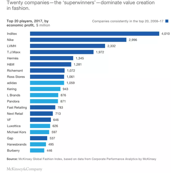 整个行业的97%的经济利润是由20家公司赚取的,其中12名是奢侈品行业。值得注意的是,20强的公司一直保持稳定。长期的领导者,包括Inditex(Zara母公司)、LVMH和耐克在内的公司,在过去的十年中的经济利润增长了一倍以上。麦肯锡还预测大中华地区将首次取代美国成为全球最大时尚零售市场。