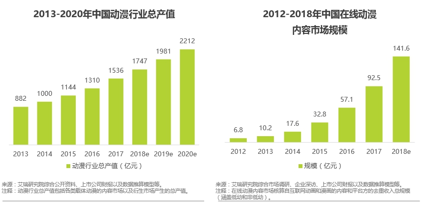 据艾瑞咨询统计分析,2013年以来,我国动漫产业总产值一直稳步提升,在2017年,已经达到1536亿元。同时,从2013年起,中国在线动漫内容市场规模持续快速扩张。2012年,中国在线动漫内容市场规模仅6.8亿元,到2017年,已经攀升至92.5亿元。报告预测2018年的市场规模达到141.6亿元。