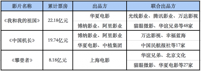 具体来看,《我和我的祖国》出品方有华夏电影、博纳影业、阿里影业,联合出品方包括光线影业、腾讯影业、万达影视、猫眼微影、华谊兄弟、华策影视、文投控股等48家。《中国机长》出品方为博纳影业、阿里影业、华夏电影、中植集团,联合出品方包括万达影视、幸福蓝海等17家。《攀登者》出品方为上海电影,联合出品方包括华谊兄弟、北京文化、华夏电影、猫眼微影、万达影视等27家。