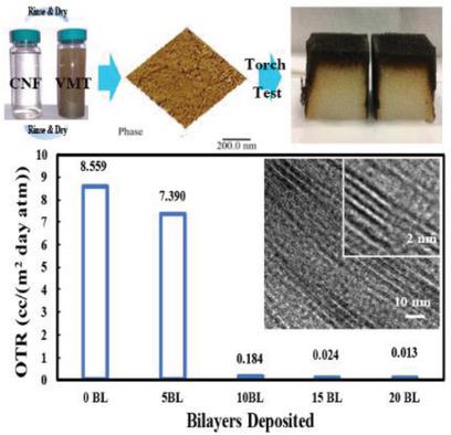 作为水基溶液应用于多层,它结合了从植物细胞壁获得的纤维素纳米纤维(微纤维),以及蛭石粘土的纳米片。当溶液干燥时,它变成薄的透明薄膜,其中纤维和薄片堆叠在一起形成砖墙状结构。这可以作为不易燃、不透氧的屏障,最大限度地减少可以到达下面材料的热量。