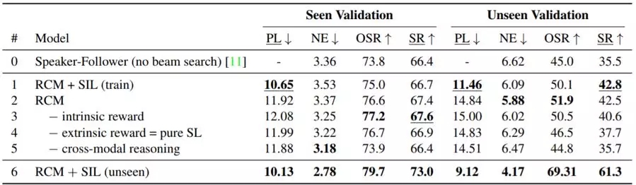 实验表明 RCM 能在 R2R 数据集上达到新的当前最佳表现,在 VLN Challenge 的 SPL 方面(该任务最可靠的指标)也优于之前的最佳方法,排名第一。
