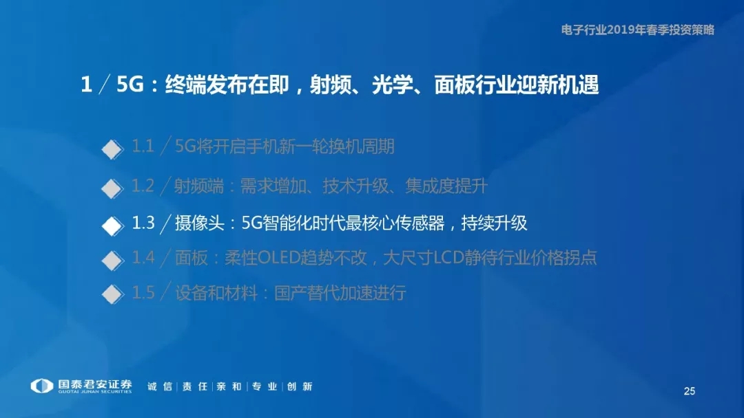 导读:本报告认为,2020年5G将会迎来换机高峰,消费电子板块的5G行情则有望提前半年开始演绎。这里我们为大家分享国泰君安证券关于“电子行业2019年春季投资策略,5G AI系列研究”报告,详看哪些产业将迎来黄金期。