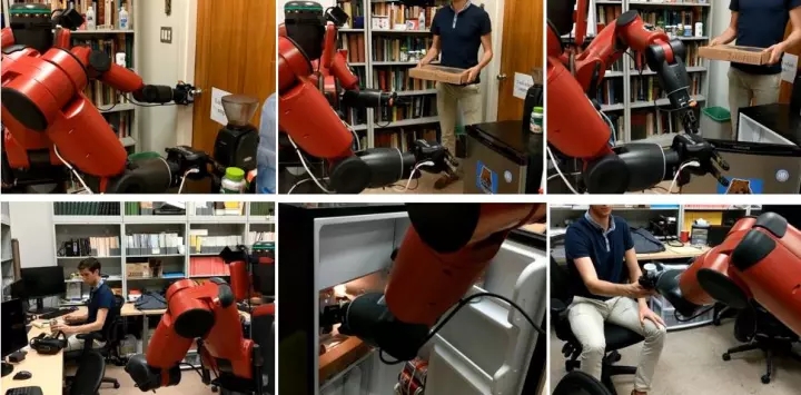 下面,我就简单介绍几个我实验室得到的初步演示结果,后台没有遥控的人。我实验室用的是一个通用的Baxter机器人,配上一个万向移动的底座和两个抓手(grippers),还有一些传感器、摄像头等。两个抓手是不同的,左手力道大,右手灵活。很有意思的是,如果你观察过龙虾等动物,它的两个钳子也是不同的,一个用来夹碎、一个是锯齿状的。