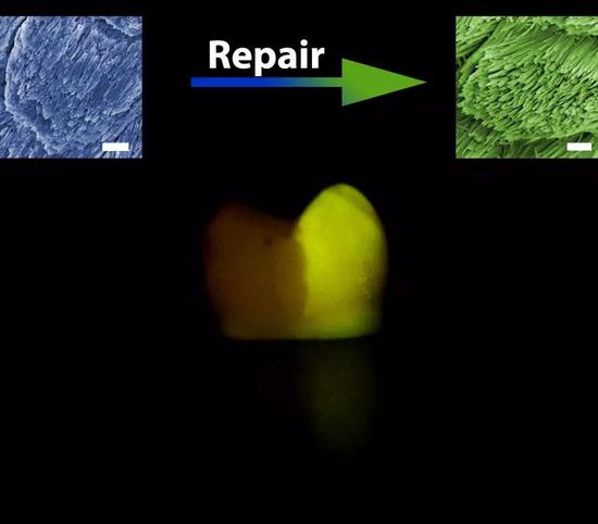 单颗人牙的照片。左边黑色区域为未修复的牙,右侧黄绿色区域为用我们材料修复后的人牙(颜色是由荧光标记物产生,用于区分两个区域)。两张插入图是修复前后的牙釉质扫描电镜图,白色标尺为1微米。