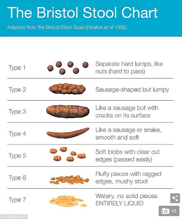布里斯托尔粪便测量表从1型(定义为与便秘有关的“单独硬块”)至7型(定义为与肠道炎症有关的“液体稠密、无固体块”),正常粪便一般是3型或者4型,就像“光滑柔软的香肠或者蛇”一样。