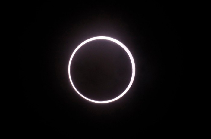 日环食发生时,天空中的太阳变成了一个圆环,金光灿灿犹如一只‘金指环’。