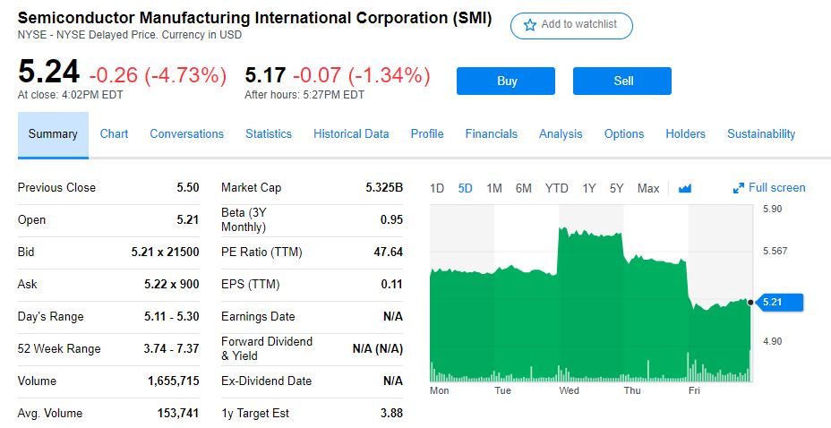 消息公布后,周五美股盘前,中芯国际ADR跌超4%,开盘后一路走低,盘中最深跌7%,收跌4.73%,报收5.24美元,创5月17日以来的一周最低,今年以来累涨28%,但过去12个月累跌19.4%。去年10月一度跌破4美元,创至少2016年7月以来股价最低。