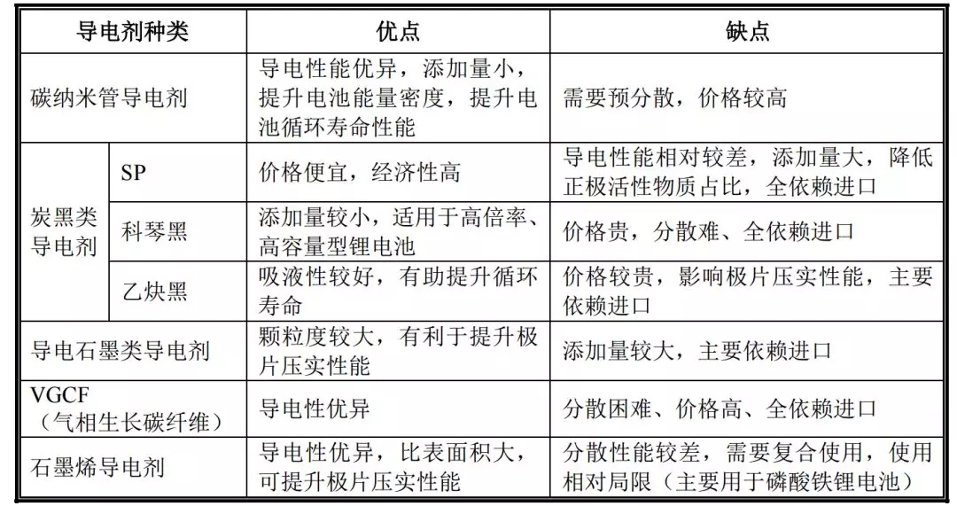 不同类型导电剂由于空间结构、产品形貌、接触面积不同,其导电性能和对锂电池能量密度、倍率性能、寿命性能和高低温性能影响不同,下表为目前市场上主要几种导电剂性能对比: