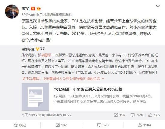 1月6日下午,TCL集团发布公告,宣布小米集团战略入股TCL集团,占TCL总股本的0.48%。TCL集团在这次公告中披露了2018年底与小米集团达成的战略合作协议,“双方将开展在智能硬件与电子信息核心高端基础器件一体化的联合研发”。