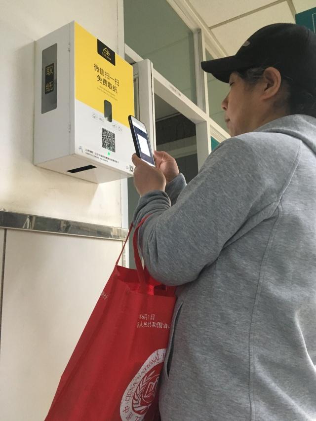 同仁医院一层女厕外,正在扫码取纸的市民