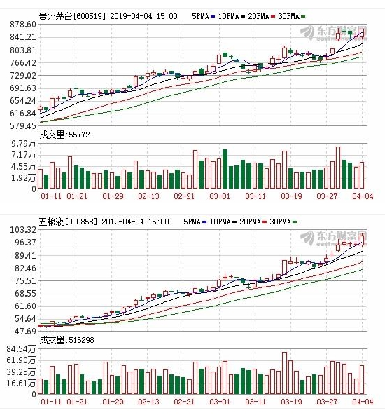 4月4日不仅是五粮液股价创历史新高,当天,贵州茅台发布了2019年第一季度主要经营数据,营业总收入同比增长20%,净利润同比增长30%左右。