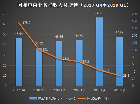 网易自2017年第四季度开始单独公布电商业务的财务数据,如今,其营收同比增速已经从175%下降至2018年第四季度的64.8%,再到本季度的28.3%。