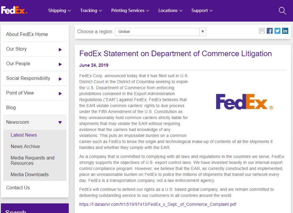 目前,美国联邦快递公司已经其官网上通报了此事,并简单介绍了起诉美国商务部及其“出口管理条例”(Export Administration Regulations,简称“EAR”)的原因。