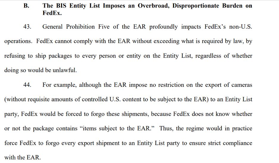 接下来,在一份更详细的诉状中,联邦快递还详细列举了他们认为美国商务部及其“出口管理条例”多处刁难联邦快递公司,甚至越权违规的地方。这也是真正值得大家关注的地方。