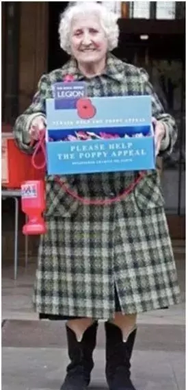 她几十年如一日地坚持卖塑料罂粟花,为皇家退伍军人协会筹款,除此之外,她还捐助了二十几个慈善机构,她的退休金因此全部投入进来。