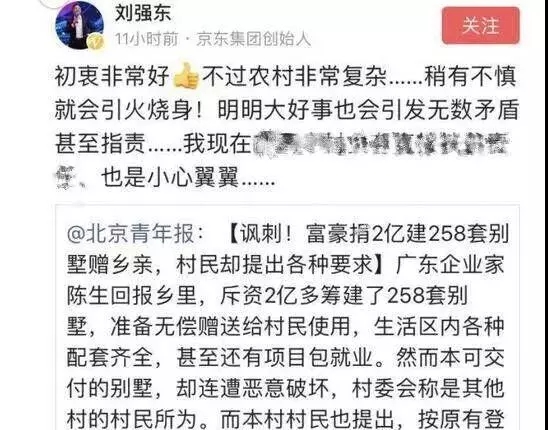 看到人的私心贪欲,身肩村长之职的刘强东对此感同身受:“初衷是好的,不过农村非常复杂……稍有不慎就会引火烧身!明明大好事也会引发无数矛盾甚至指责……我现在在两个村负有直接扶贫责任,也是小心翼翼……”