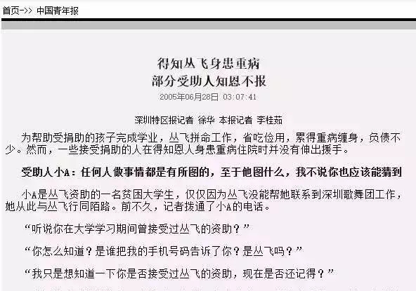 很难想象丛飞最后的日子是怎么度过的。家徒四壁,他去世的时候,女儿还不到一岁,那些他曾经拼命工作省吃俭用去帮助的人,在他频死时刻,还在和他伸手要钱,态度冰冷而强硬,很多学生甚至拒绝承认被丛飞资助过,更别提看望。