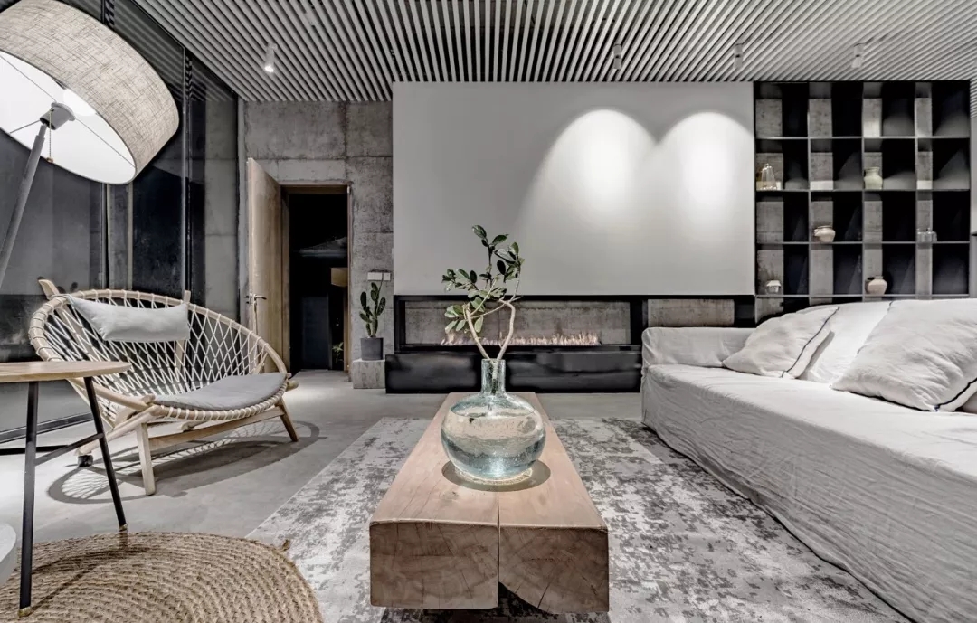 在夯土墙和客房之间,用一道玻璃墙隔开,再用灯光打亮夯土墙。一方面增加了室内的采光,另一方面,使夯土墙犹如立于聚光灯下获得一种舞台感呈现,也使体验者退而观之,同夯土墙拉开距离,心中会升起一种仪式感。原本日常的睡眠,变成了一种回忆与观望。