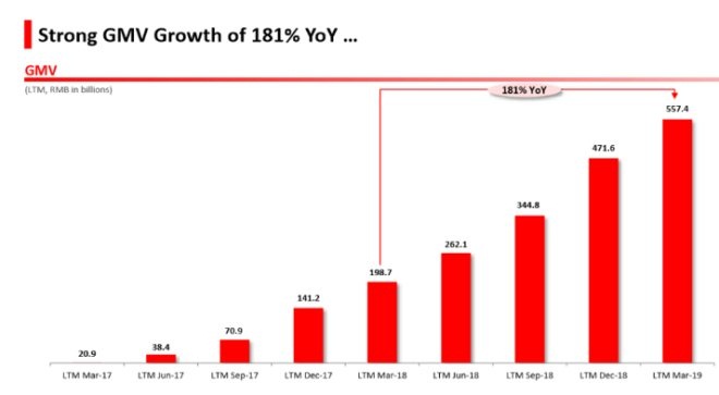 财报数据显示,截至2019年3月31日的12个月期间,拼多多平台GMV为5574亿元,较去年同期的1987亿元同比增长181%。