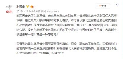 2018年1月,京东集团董事局主席兼首席执行官刘强东到访东北三省,计划三年内在东北进行超过200亿元的投资。为此,他还发了微博: