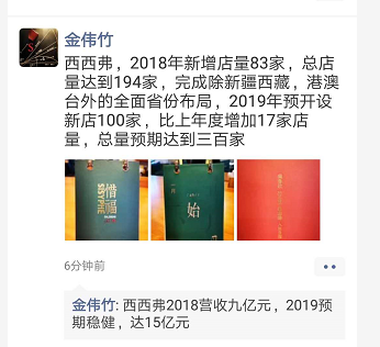 更令人惊喜的是,2018年,西西弗营收实现9亿元。这样的战绩,令西西弗董事长金伟竹在朋友圈忍不住赞叹(如下图),并且给出了2019年新的战略目标:全国新开店100家,总量预期达到300家,营收方面向15亿元冲刺。