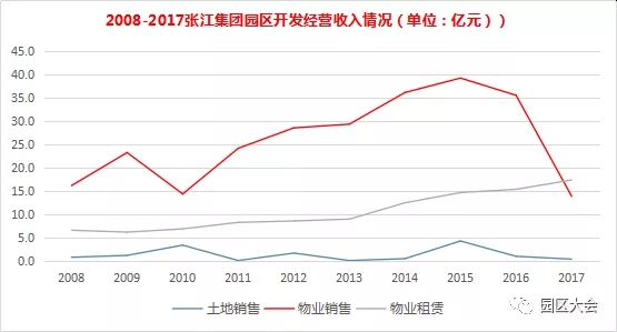从2008-2017年的10年的数据我们可以看出,张江集团园区开发收入由土地销售、物业销售和物业租赁三个部分组成;整体上除2017年外,张江集团园区开发收入大部分都由物业销售贡献,其次是物业租赁,土地销售较少,已经改变了早期主要由土地收入占据主导地位的模式。值得注意的是,2017年,张江集团物业租赁的收入首次超过了物业销售收入。