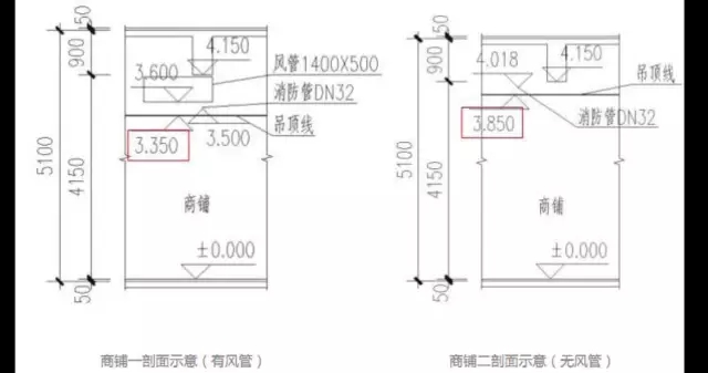 以万科壹海城项目为例,商铺层高为5.1m,梁高为0.9m。商铺中有风管在不加吊顶情况下净高为3.35m,无风管商铺在不加吊顶情况净高为3.85m。