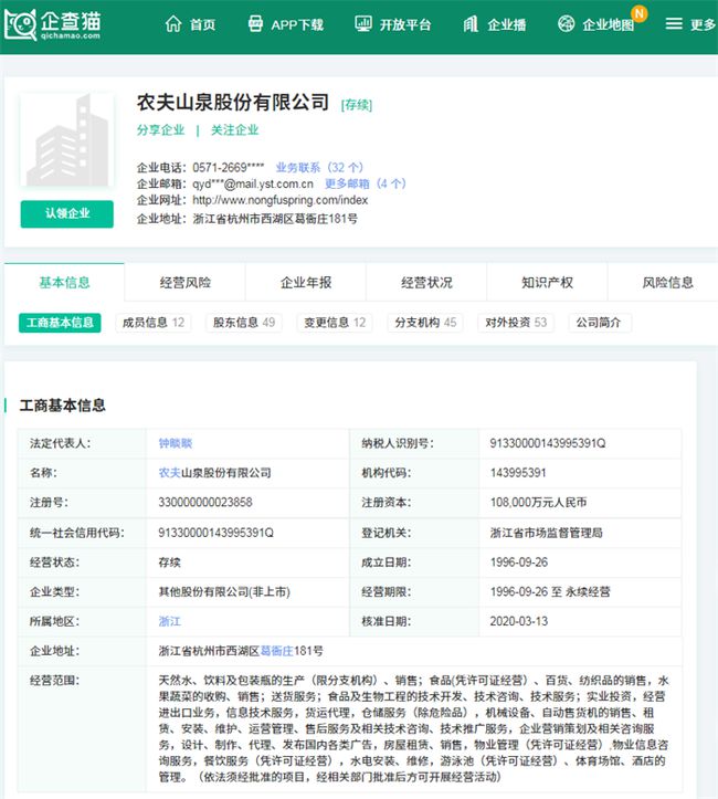 企查猫资料显示,农夫山泉股份有限公司成立于1996-09-26,法定代表人钟睒睒,主要从事天然水、饮料及包装瓶的生产(限分支机构)、销售;食品(凭许可证经营)、百货、纺织品的销售,水果蔬菜的收购、销售;送货服务;食品及生物工程的技术开发、技术咨询、技术服务;实业投资,经营进出口业务,信息技术服务,货运代理,仓储服务(除危险品)等。
