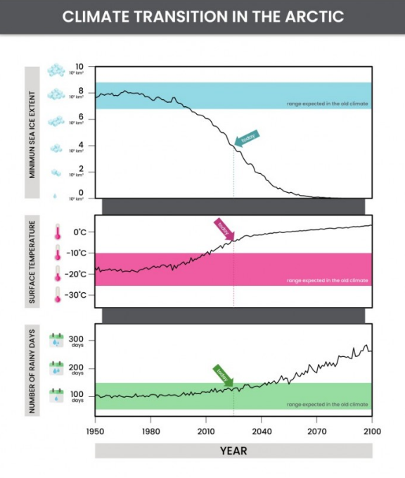 “新北极”将变得更温暖、更多雨、冰层面积更少。过去常见的动物可能会消失,取而代之的是新迁入的物种。人类利用海冰狩猎和捕鱼的机会也可能会减少。