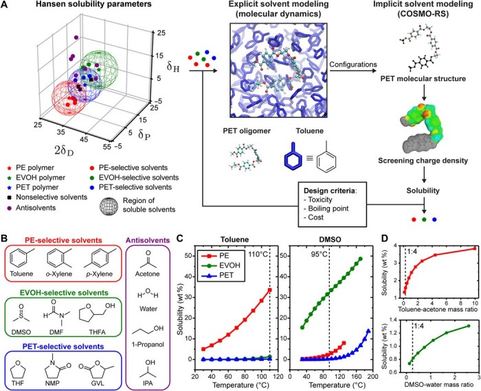 它结合了一个名为 "现实溶剂的导体样筛选模型"(COSMO-RS)的计算机系统,该系统可以计算特定聚合物在不同温度下接触不同溶剂时的溶解度。废弃的多层塑料就这样根据这个系统的建议,经过一系列的溶剂清洗。