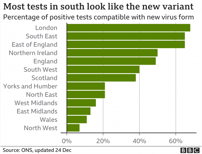 英国国家统计局估计,这些地区约三分之二的新冠病毒阳性患者可能感染了新的毒株。然而,这些数字尚未得到证实。B.1.1.7可能在英国迅速蔓延,但BBC指出,南非的病毒株也已经到达该国。在两个人身上检测到了非洲的变异毒株。英国禁止前往该国,几天后,许多欧洲国家禁止从英国起飞的航班。