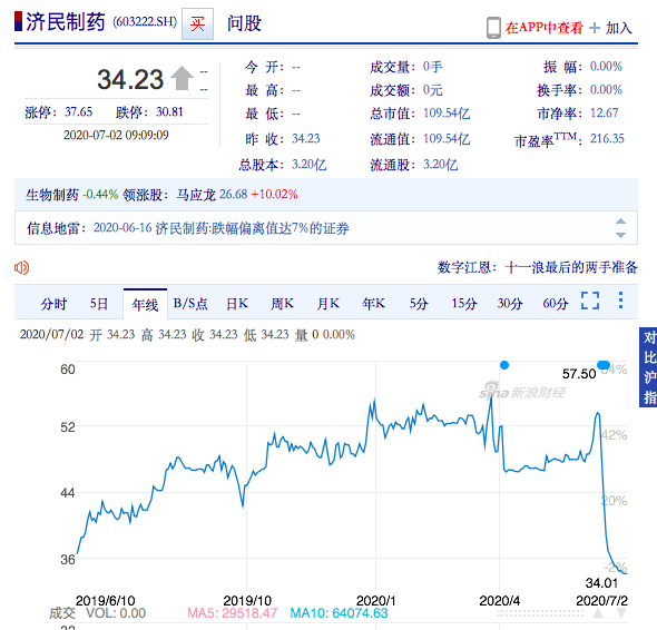 6月3日至6月9日,盛洋科技连续5个跌停板,股价从23.3元跌至13.75元,跌幅超40%,市值相应蒸发21.94亿元。6月11日当天,济民制药盘中股价一度拉升至57.5元每股,大量资金进入后,股价又重重砸了下来,12日、15日、16日三个交易日则连续三个跌停板。黄明亮介绍,他手里的股票直到17日挂跌停价才跑出来。而6月11日至6月18日期间短短的6个交易日,济民制药股价从53.44元跌至36.8元,跌幅超31%,且还有跌跌不休的趋势。6天时间,其市值蒸发约53.25亿元。